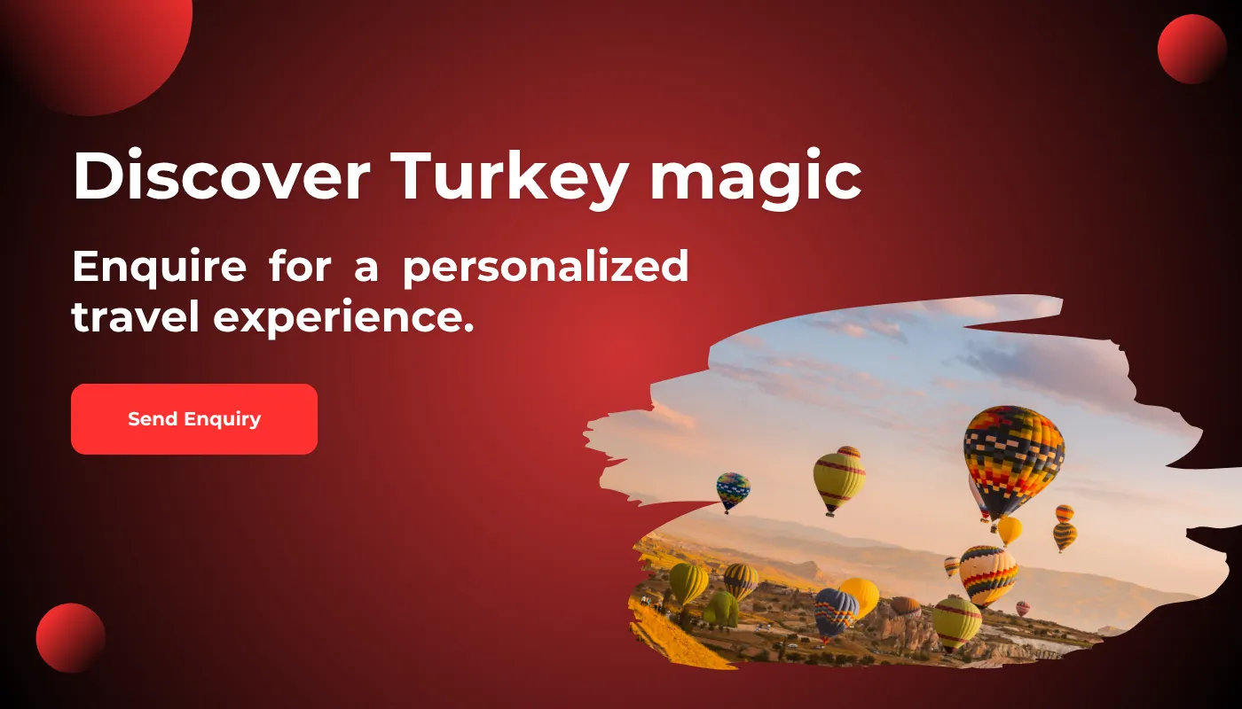 Ride a hot air balloon over Cappadocia, explore Hagia Sophia & Blue Mosque, relax in the thermal terraces of Pamukkale, and sail the turquoise waters of Antalya & Bodrum.